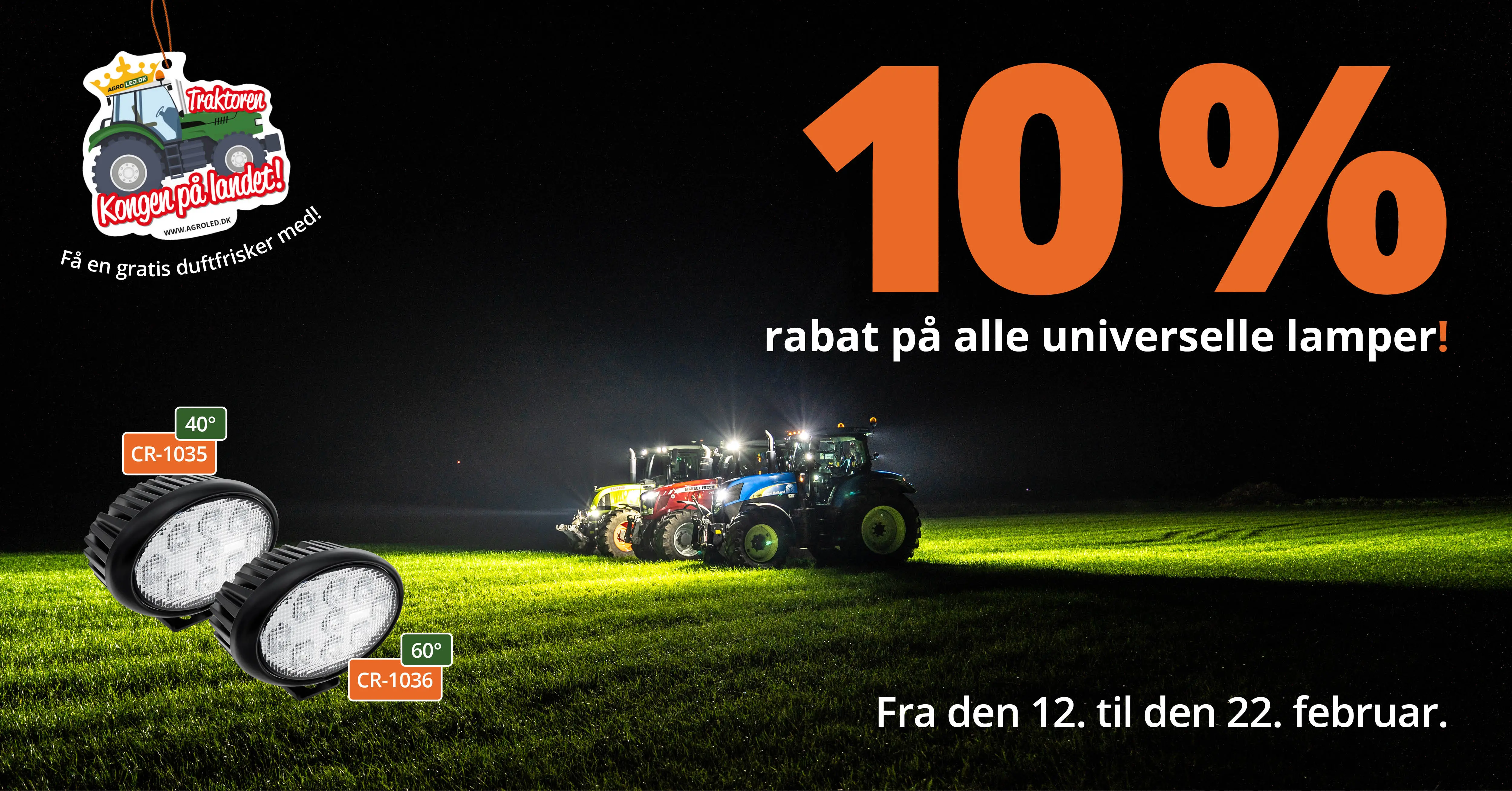 Gode nyheder! Kun i denne uge får du 10 % rabat på alle universelle lamper. På den måde findes der en passende løsning til enhver traktor!