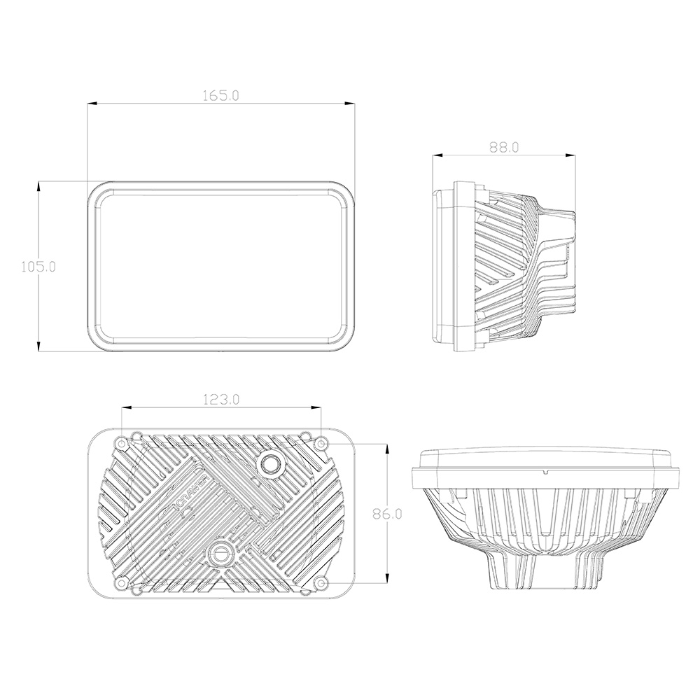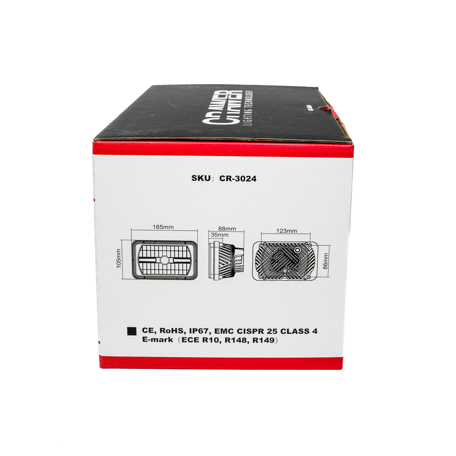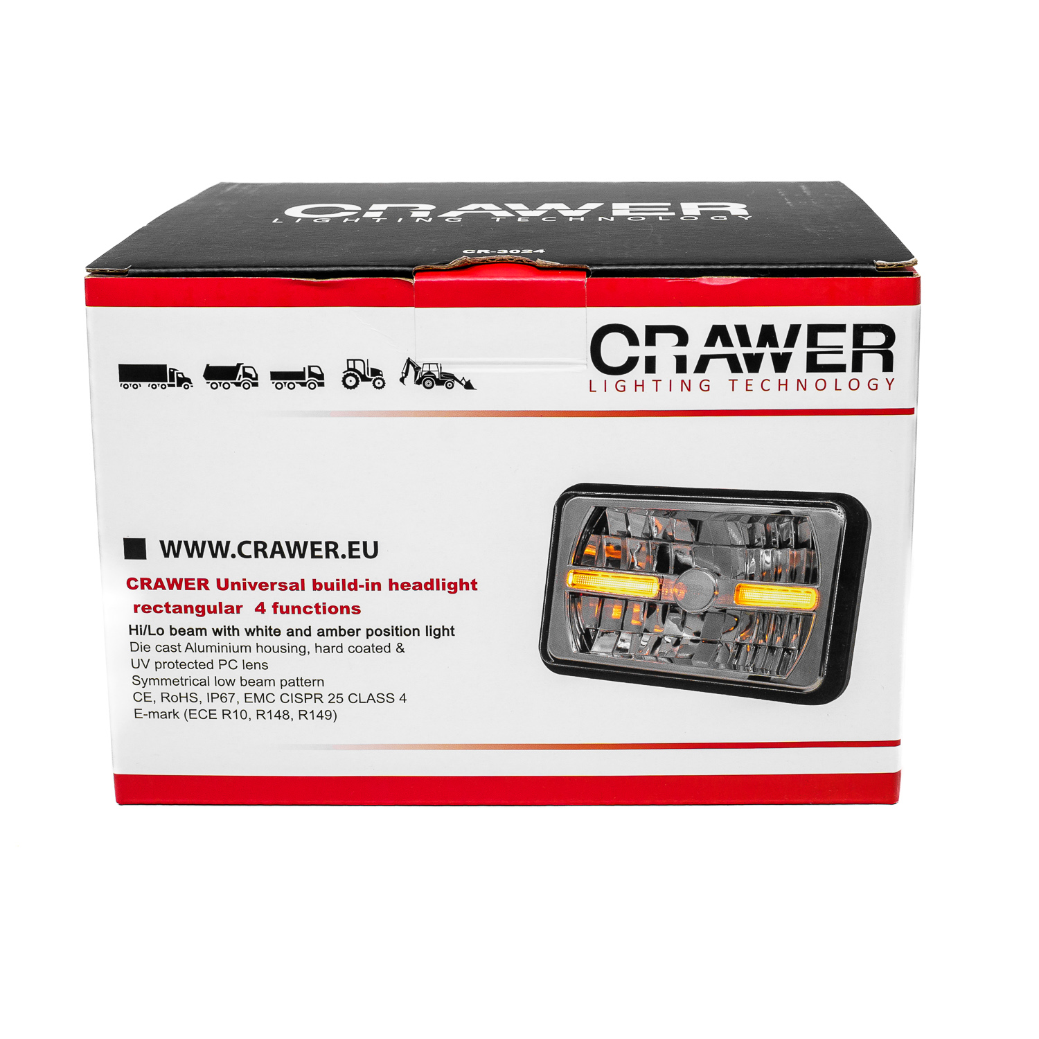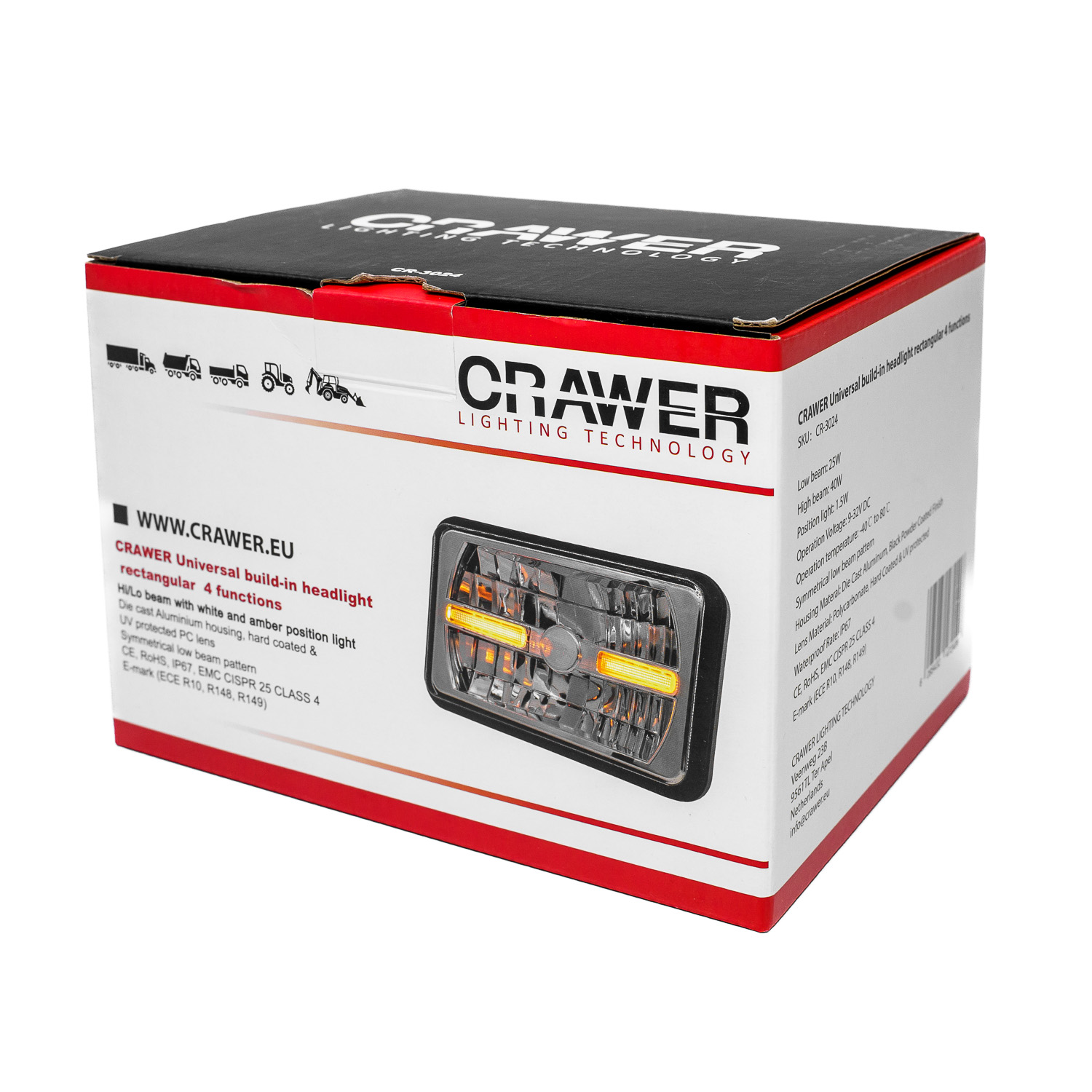 Forlygterne er fremstillet i trykstøbt aluminium med hærdet PC-linse og beslag i rustfrit stål (304). De er IP67-klassificerede og dermed både støv- og vandtætte, samt EMC-certificerede efter CISPR klasse 4 for at forhindre radiostøj. CRAWER LED-forlygterne er udviklet til professionel brug, hvor driftssikkerhed, lysstyrke og holdbarhed er afgørende – en markant opgradering fra traditionelle halogenlygter.