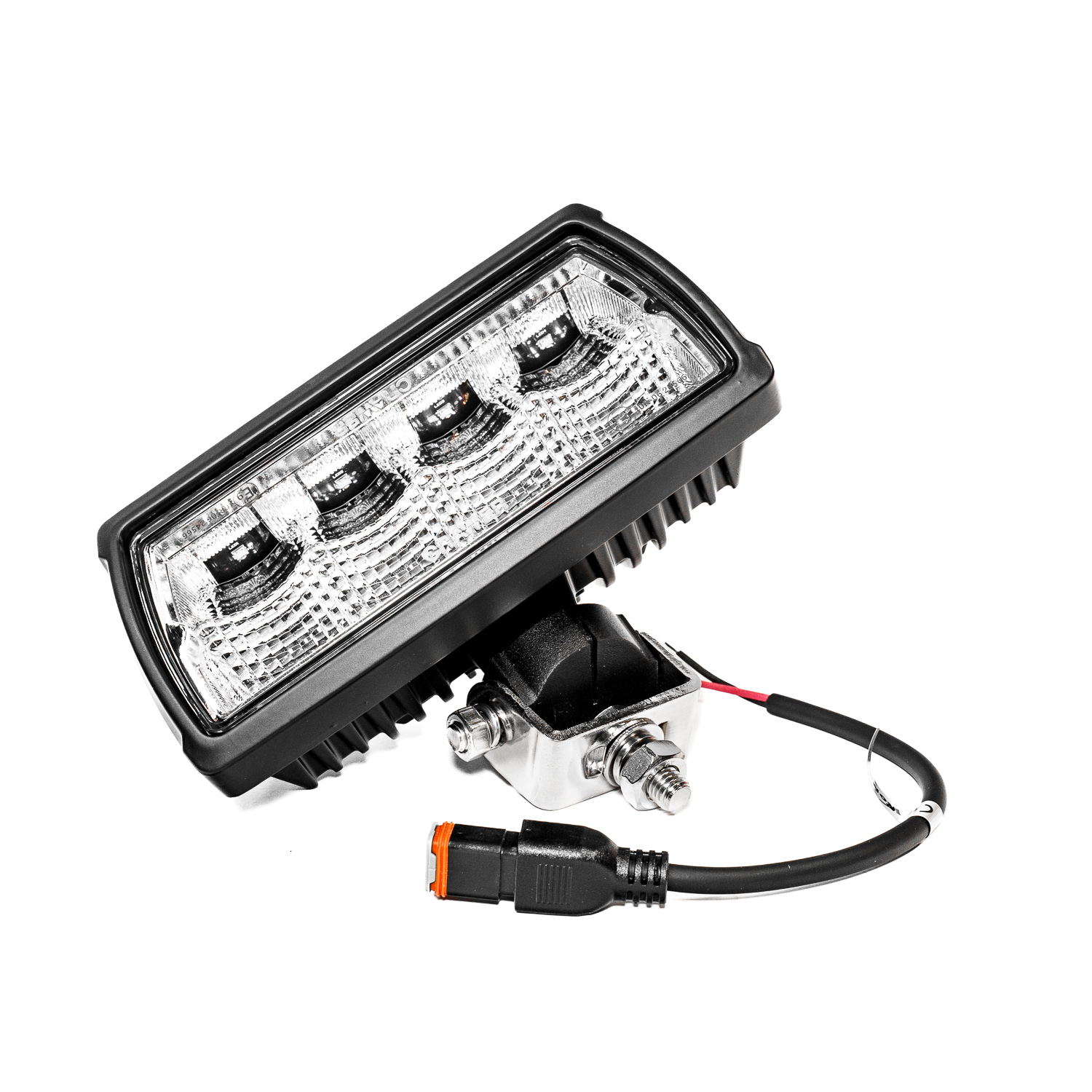 Denne LED arbejdslampe yder hele 6500 lumen fra sine 60 watt og sikrer en jævn og kraftig belysning der, hvor du har mest brug for det. Lampen tilsluttes via et Deutsch DT 2-pin stik og er EMC-beskyttet i henhold til CISPR klasse 4, hvilket betyder, at du undgår radiostøj og forstyrrelser i følsomt udstyr. Det rustfri stålbeslag giver en solid montering, og kombinationen af et aluminiumshus og en slagfast polycarbonatlinse sikrer lang holdbarhed – selv under krævende forhold i marken.