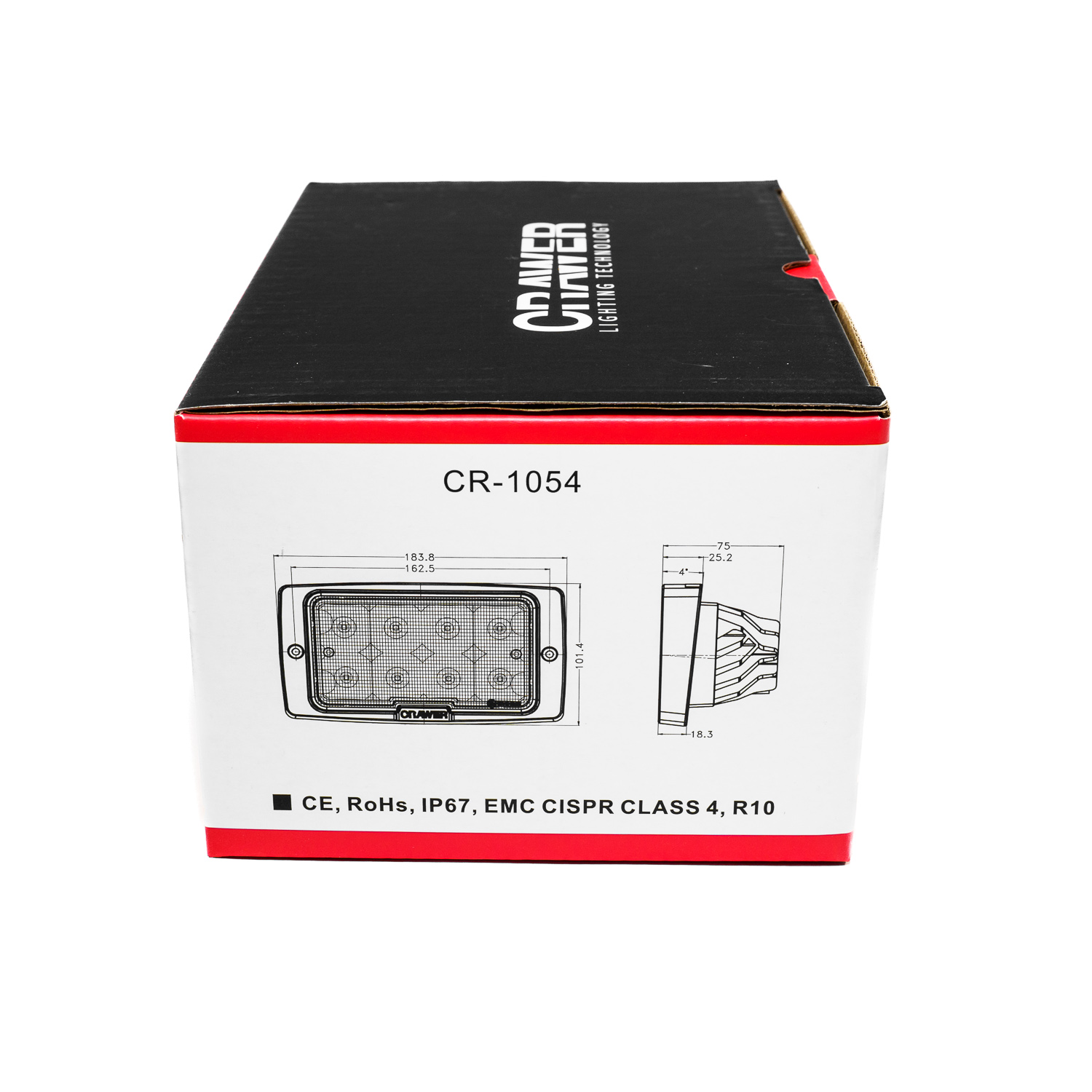 Den nye CR-1054 er konstrueret med en helt ny køleprofil, der sikrer stabil driftstemperatur og forhindrer overophedning, selv ved langvarig brug. Huset er fremstillet i robust aluminium og kombineret med en slagfast PC-linse, som modstår vibrationer og hårde arbejdsforhold. Den tidligere model var udstyret med et løst kabel, men den nye version har et integreret Deutsch DT 2-pin stik, der sikrer en professionel og vandtæt tilslutning. Lygten er IP67-klassificeret og EMC-godkendt efter CISPR Class 4, så den ikke forstyrrer køretøjets elektronik.