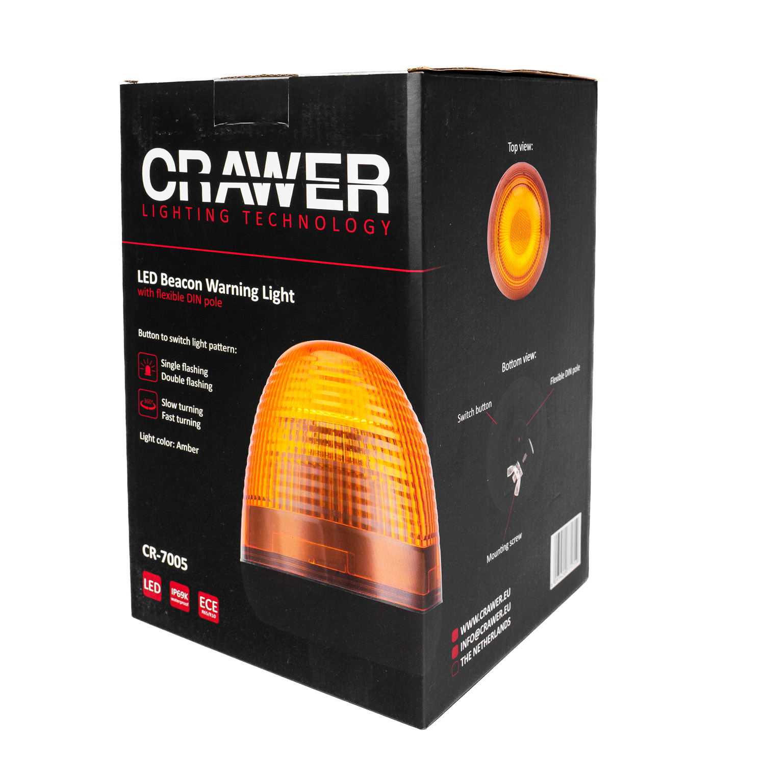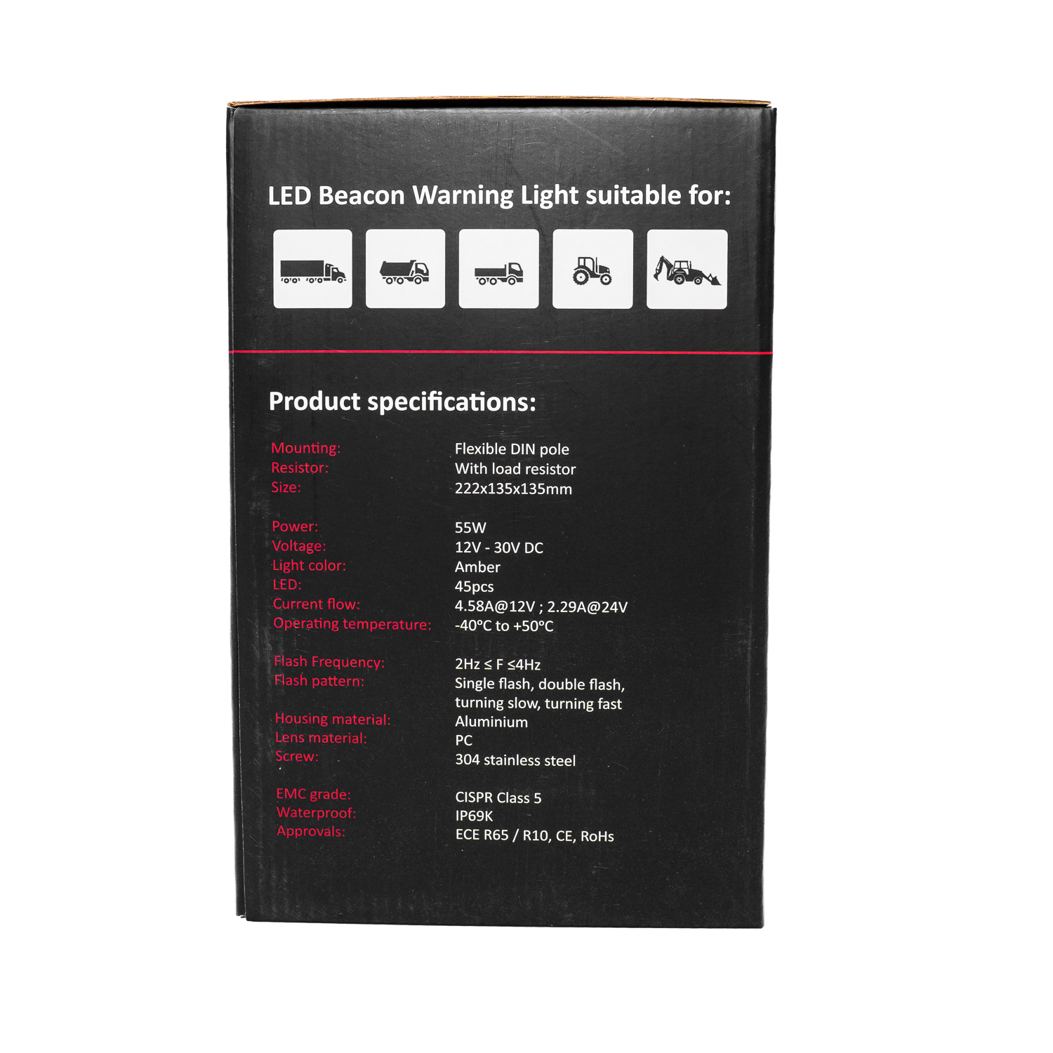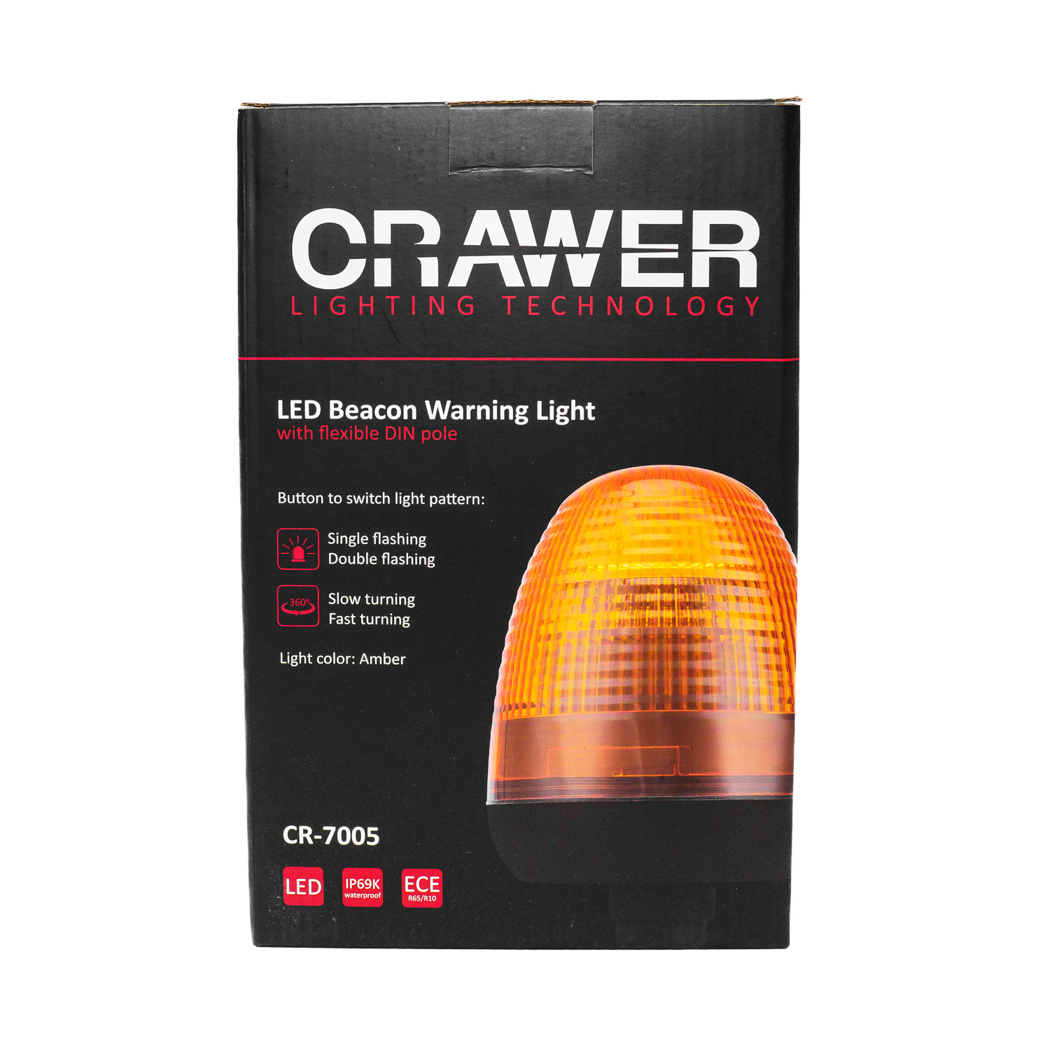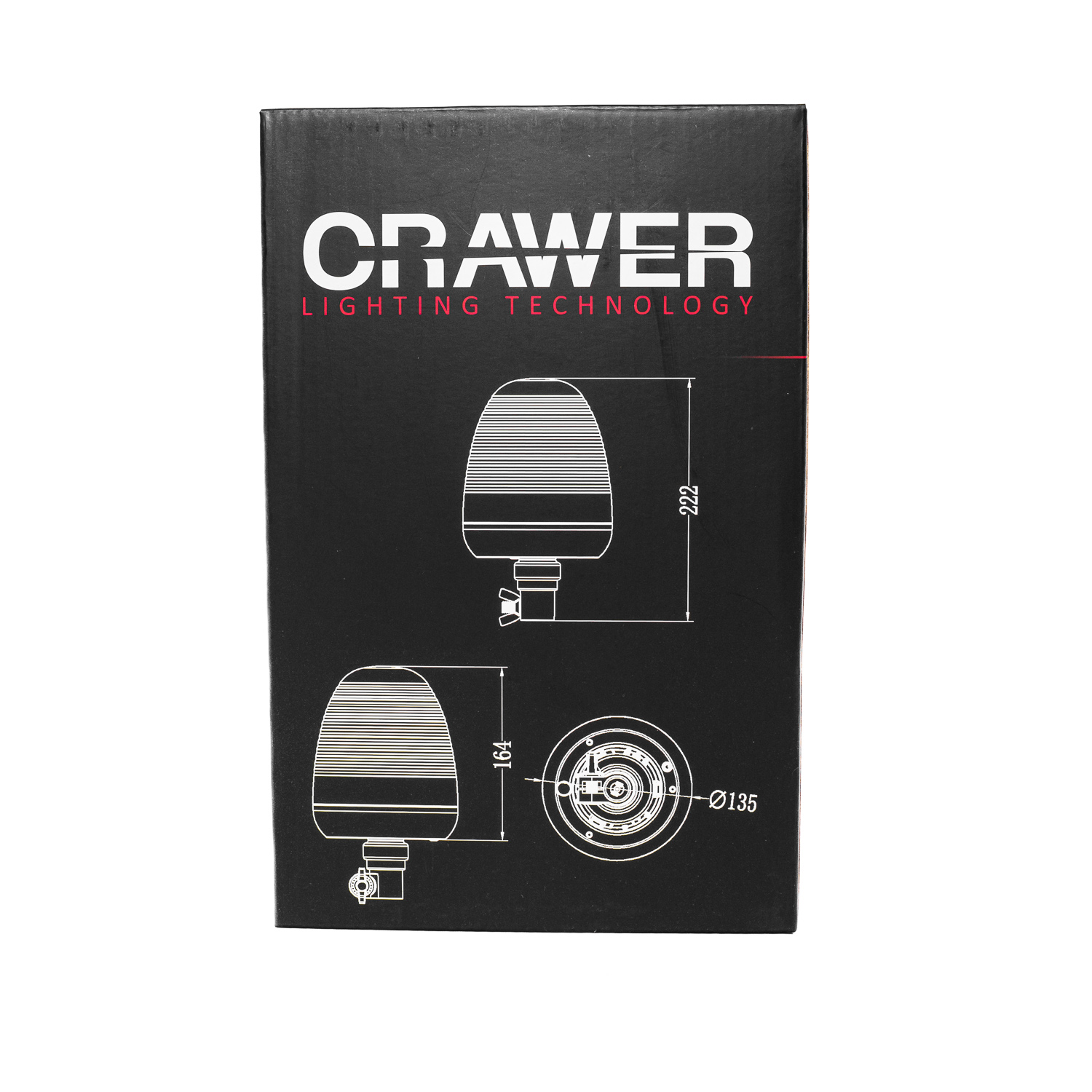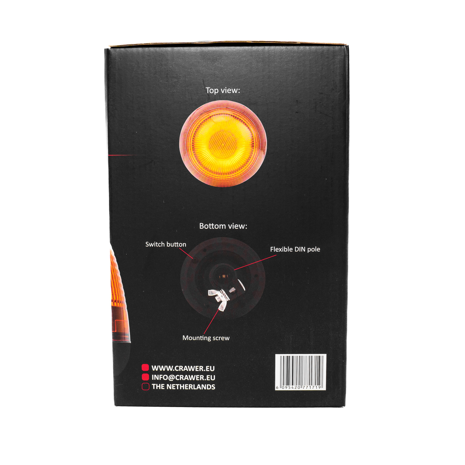 CRAWER LED rotorblink 55W – høj synlighed og fleksibel montering – Dette CRAWER LED rotorblink er udviklet til professionelt brug og leverer kraftig og tydelig advarselsbelysning med en effekt på 55W. Lygten udsender ravgult lys og er godkendt efter ECE R65 og R10, hvilket gør den fuldt lovlig til vejbrug. Den fleksible DIN-stang sørger for, at lygten kan bøje ved påvirkning, hvilket reducerer risikoen for skader og øger holdbarheden. Med et slagfast aluminiumshus og en robust PC-linse er den bygget til hårde arbejdsforhold og miljøer med vibrationer, støv og fugt.