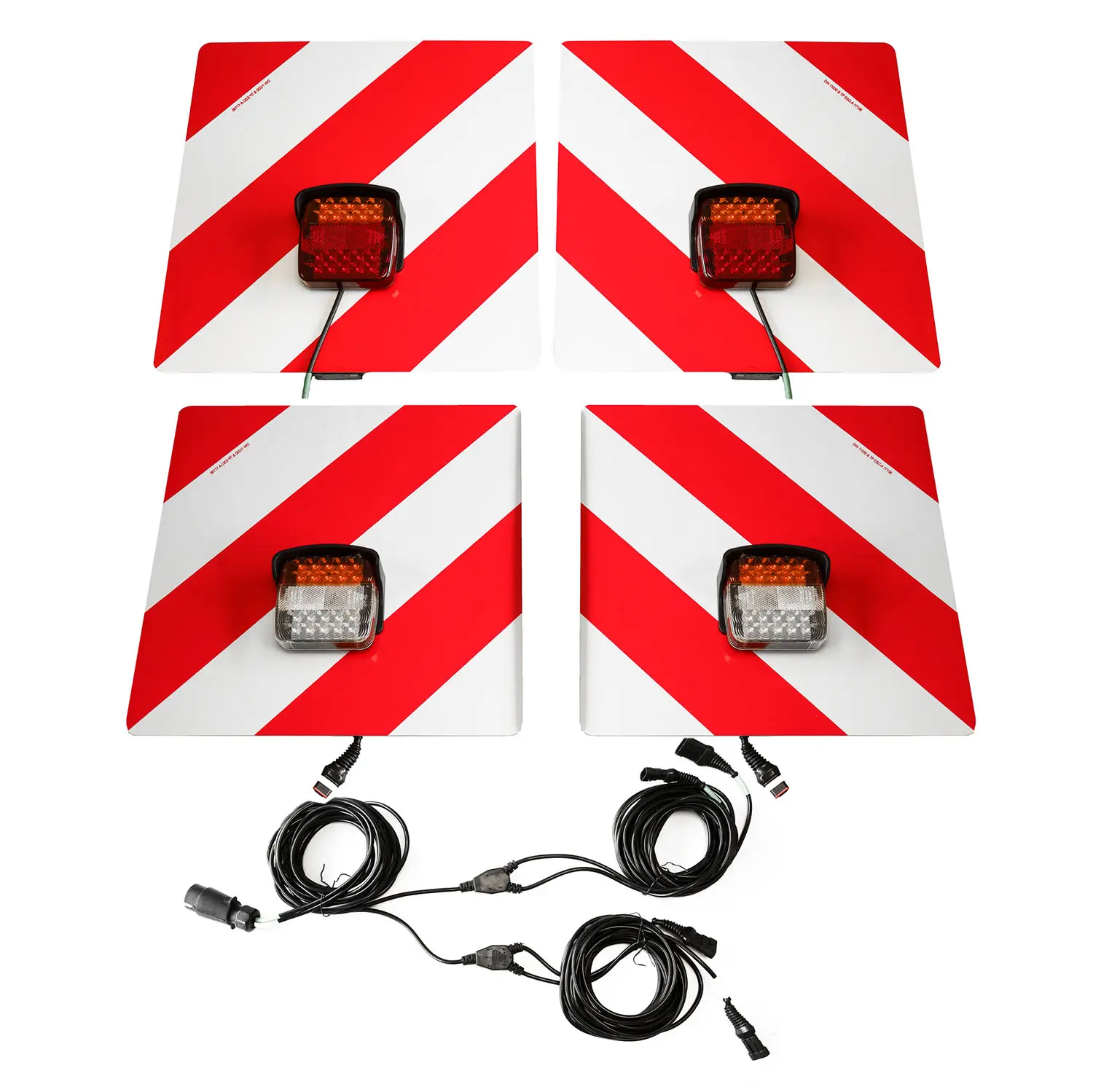 Skiltene til fronten er udstyret med en lygte med hvidt positionslys og orange blinklys. Skiltene for bag er udstyret med en baglygte med 3 funktioner; baglygte, bremselys og blinklys. De kompakte vandtætte superseal-stik giver mulighed for først at skjule kablerne på maskinen og derefter blot forbinde dem med belysningen. På denne måde behøver du ikke at skære og tilslutte kabler for at skjule kablerne ordentligt og pænt.
