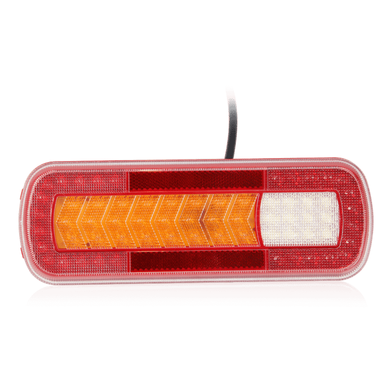 Denne LED baglygte kombinerer 5 funktioner i én kompakt enhed: kørelys, blinklys, bremselys, tågelys og baklys. Med dynamiske blinklys får du en tydelig og moderne signalering, der øger sikkerheden i trafikken. Baglygten kan anvendes både til venstre og højre side og er udstyret med 64 LED-dioder, som sikrer et kraftigt og klart lys. Den er IP68-klassificeret og dermed støv- og vandtæt. Fremstillet med hus af ABS, linse af PMMA og beslag i polycarbonat er baglygten robust og modstandsdygtig – perfekt til krævende forhold.